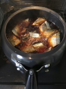サンマを筒切りにして内臓を出して洗い、軽く霜降りにした後で圧力鍋に入れます。