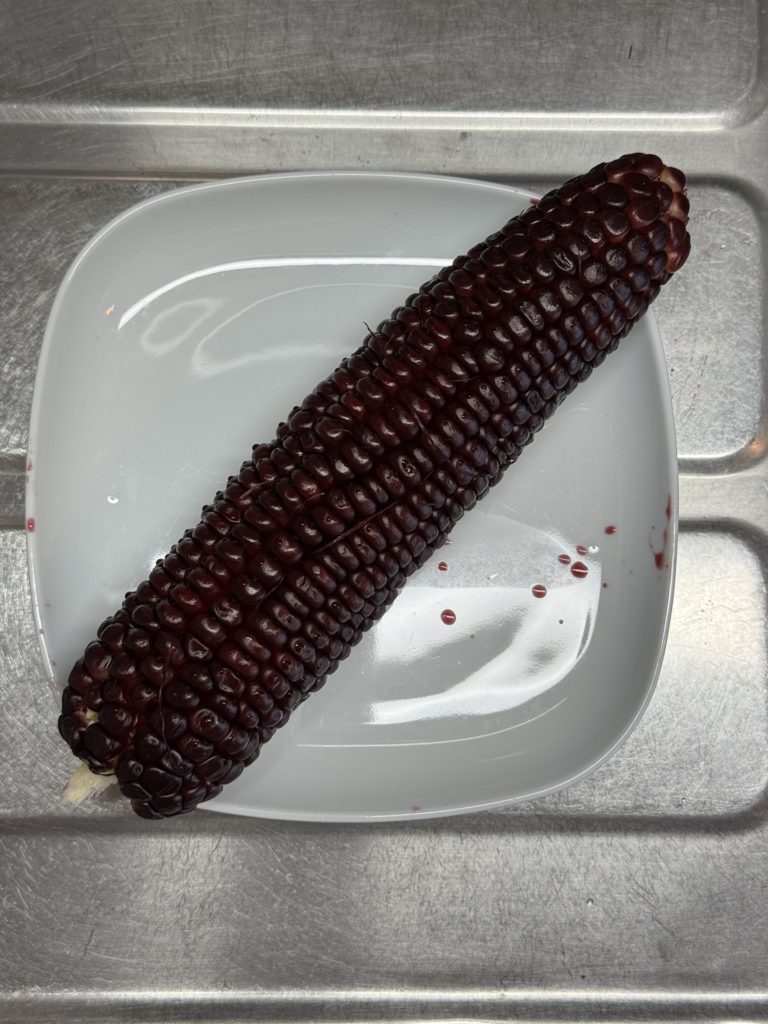 このとうもろこし、皮を剥くと中身が真っ赤なのです!珍しい!