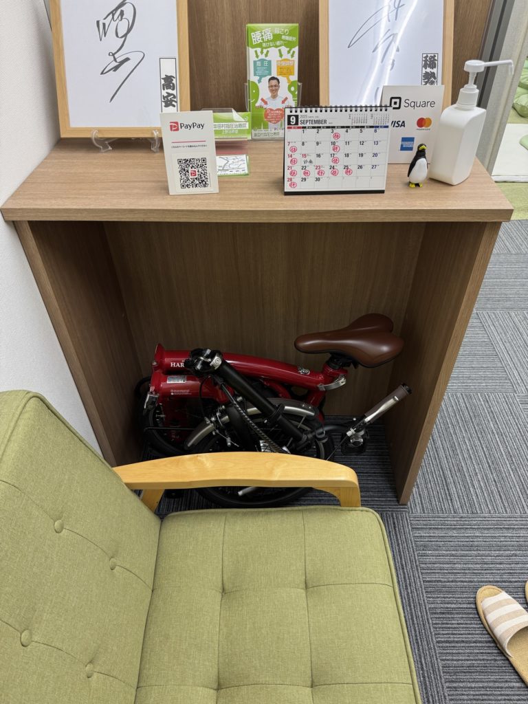 最近、上野治療室にそっと置いてある折りたたみの自転車。