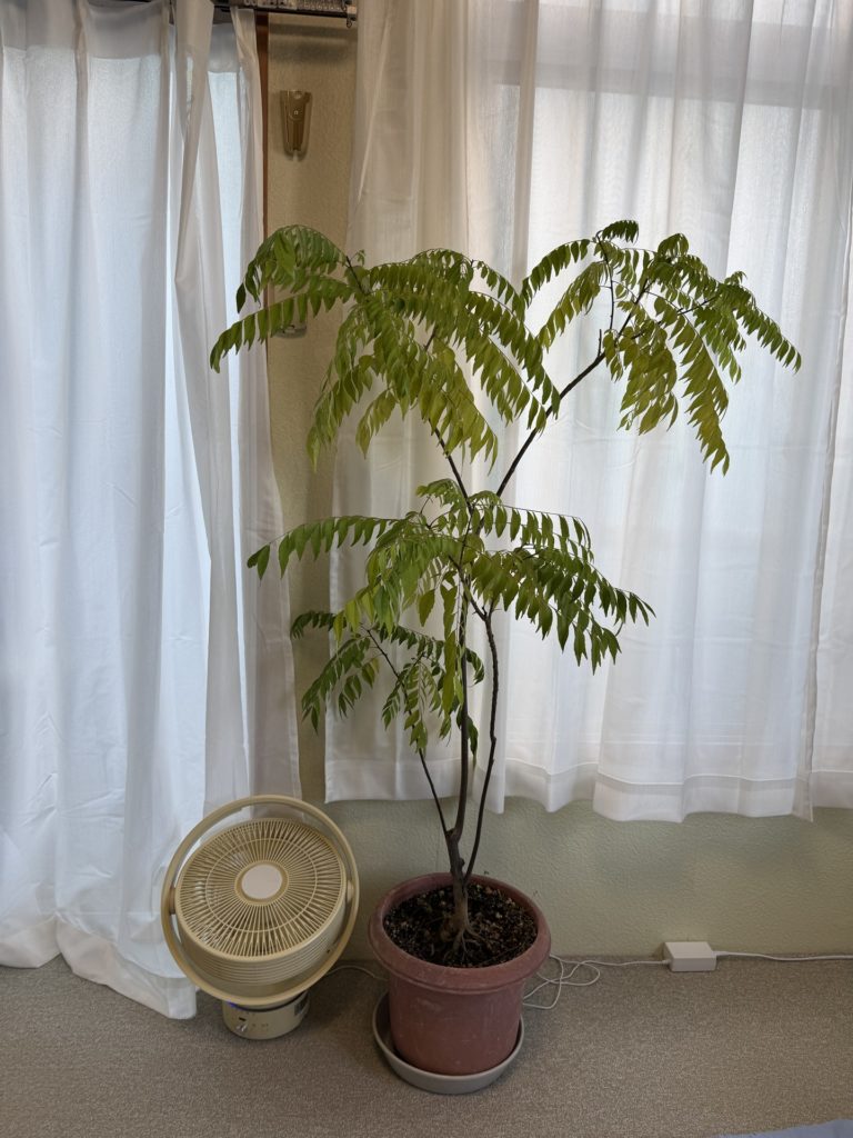 屋内です。ポトスの横にライチが来ています。