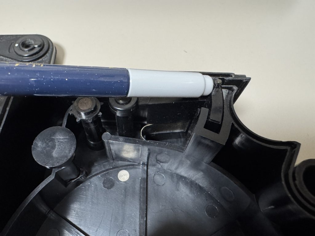フィルムが出てくる口の部分にバネがついており、ここの突起を引き下げて