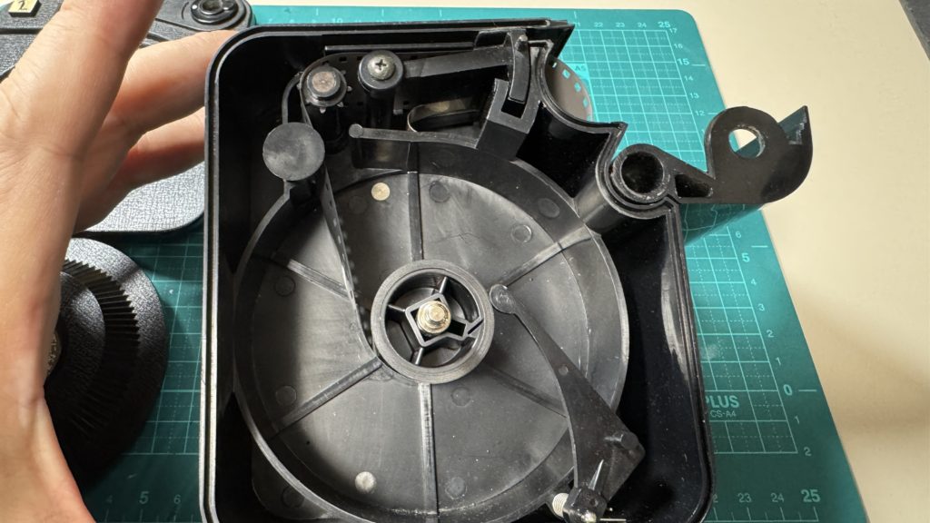 右下の腕の部分がバネになっており、これがフィルム残量のカウンターに連動しています。